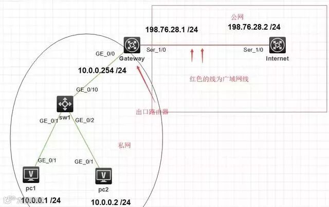 拓扑图如下图所示:内网两台10.0.0.0/24网段的PC需要通过Gateway设备进行NAT地址转换,来到达访问公网的目的。
