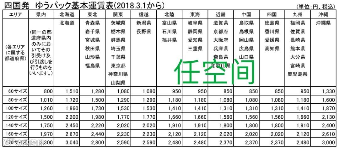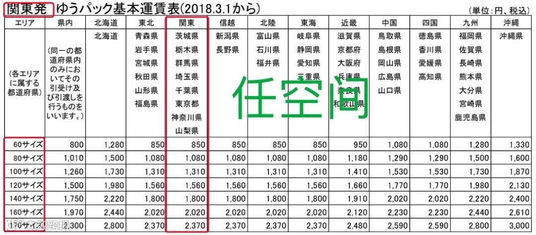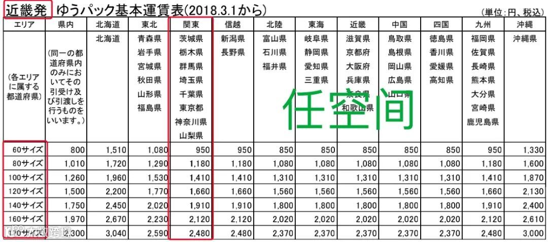 日本的运费是根据包裹尺寸/重量而定,这个是日本邮政ゆうパック寄东京地区(任空间仓库)的运费表,黑猫和佐川的也差不多,相差不是很大,友友们可以参考。