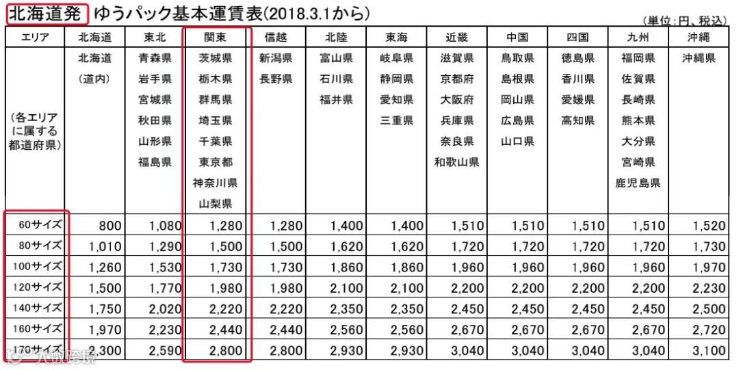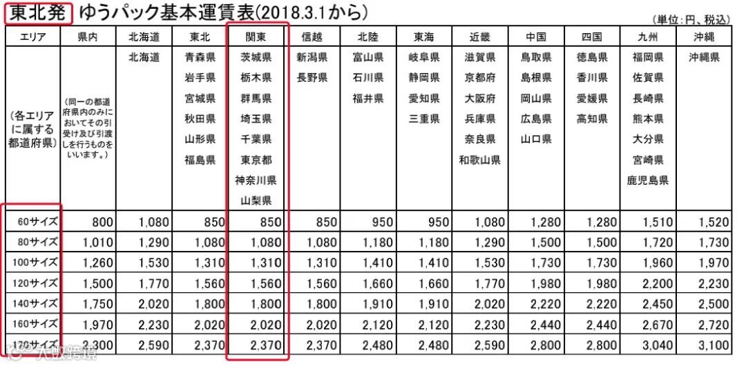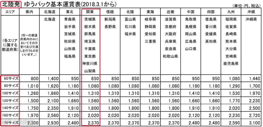 第一列数字代表长宽高之和,日本运费是以体积为主的,辅助该体积下的重量限制,再按地区划分,发货地不同到东京新宿的价格也不同。从表里可以看出最便宜也要850日元(约50rmb)。
