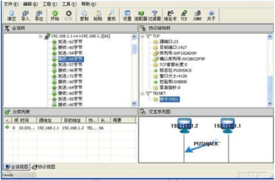步骤二:使用协议分析器端捕获数据, 从协议的角度分析该次 telnet