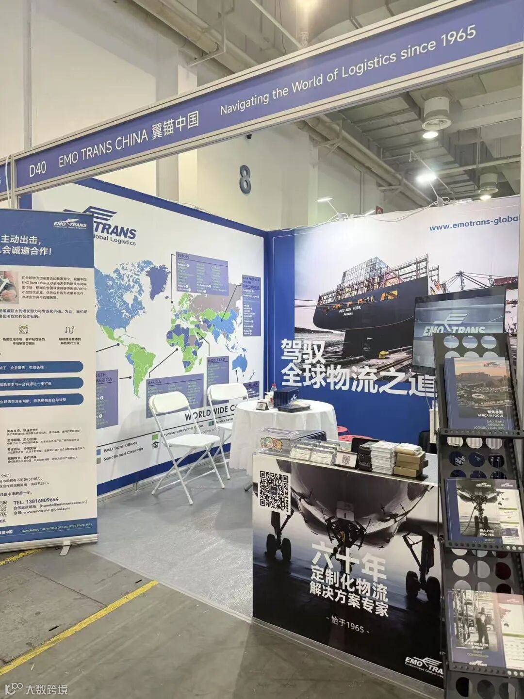 秉承EMO德国一贯的严谨与品质,我司展台及宣传物料设计采用清新蓝白主调,“驾驭全球物流之道”和“六十年定制化物流解决方案专家”两行大字凸显在展板上,设计方案巧妙运用留白艺术,整体视觉简约大气,尽显国际品牌风范。这份匠心独具的设计在展会现场赢得了众多物流同行的高度评价,盛赞我司“极具审美品位”。