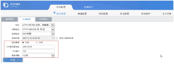 在【系统配置】中【基本配置】的时间配置中,当从机注册成功后,会通过NTP时间同步方式,每个1个小时同步从机和主机的时间。其中NTP服务器地址为主机的IP地址。
