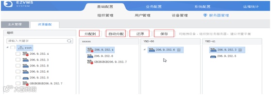 在【基础配置】中的【服务器管理】可以对设备资源进行重配,即改变设备的所属服务器。界面中主要有四个功能键,分别为<分配到>、<自动分配>、<还原>、<保存>。