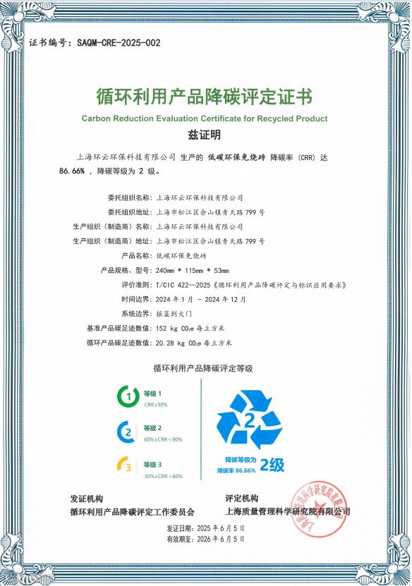 低碳环保免烧砖采用装修垃圾预处理后形成的再生骨料直接制砖,免去传统砖块的烧制过程,有效减少碳排放,符合“绿色、生态、环保”和“资源利用—产品—资源再生”的循环经济理念。根据《循环利用产品降碳评定与标识应用要求》(T/CIC 422-2025),经上海质科院评定,两个项目的低碳环保免烧砖降碳率分别为86.66%、77.12%,降碳等级均达到2级。