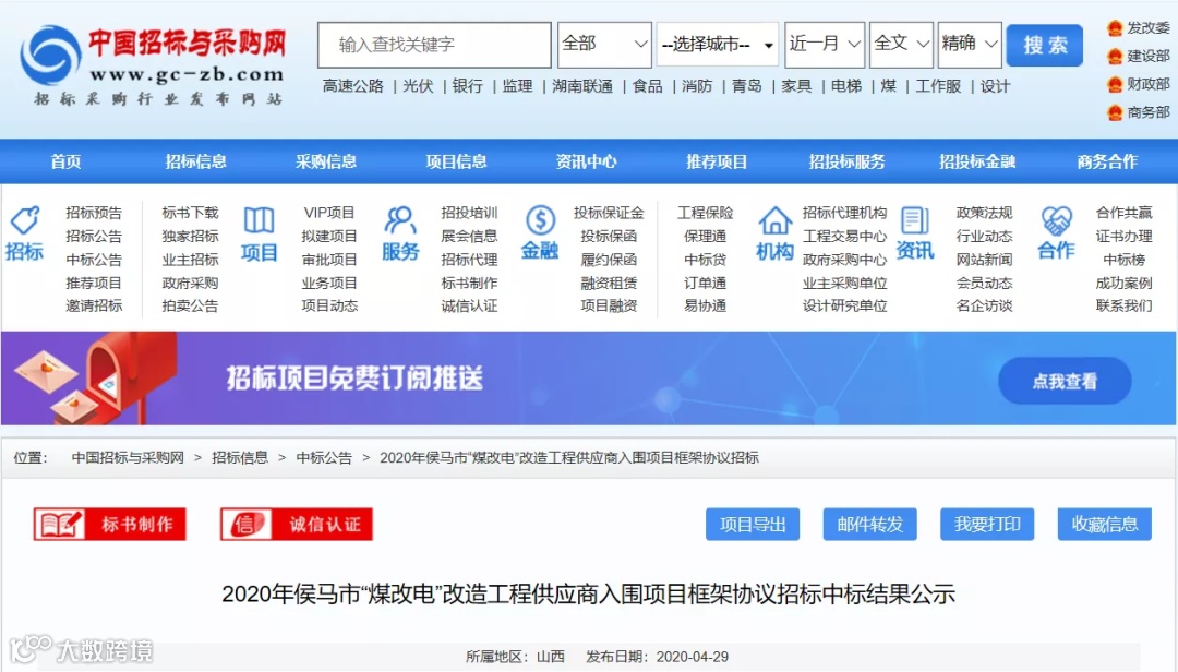 4月29日,山西侯马市“煤改电”改造工程供应商入围项目中标结果公示,华天成以绝对优势位居一标段榜首,成功中标2020年侯马市“