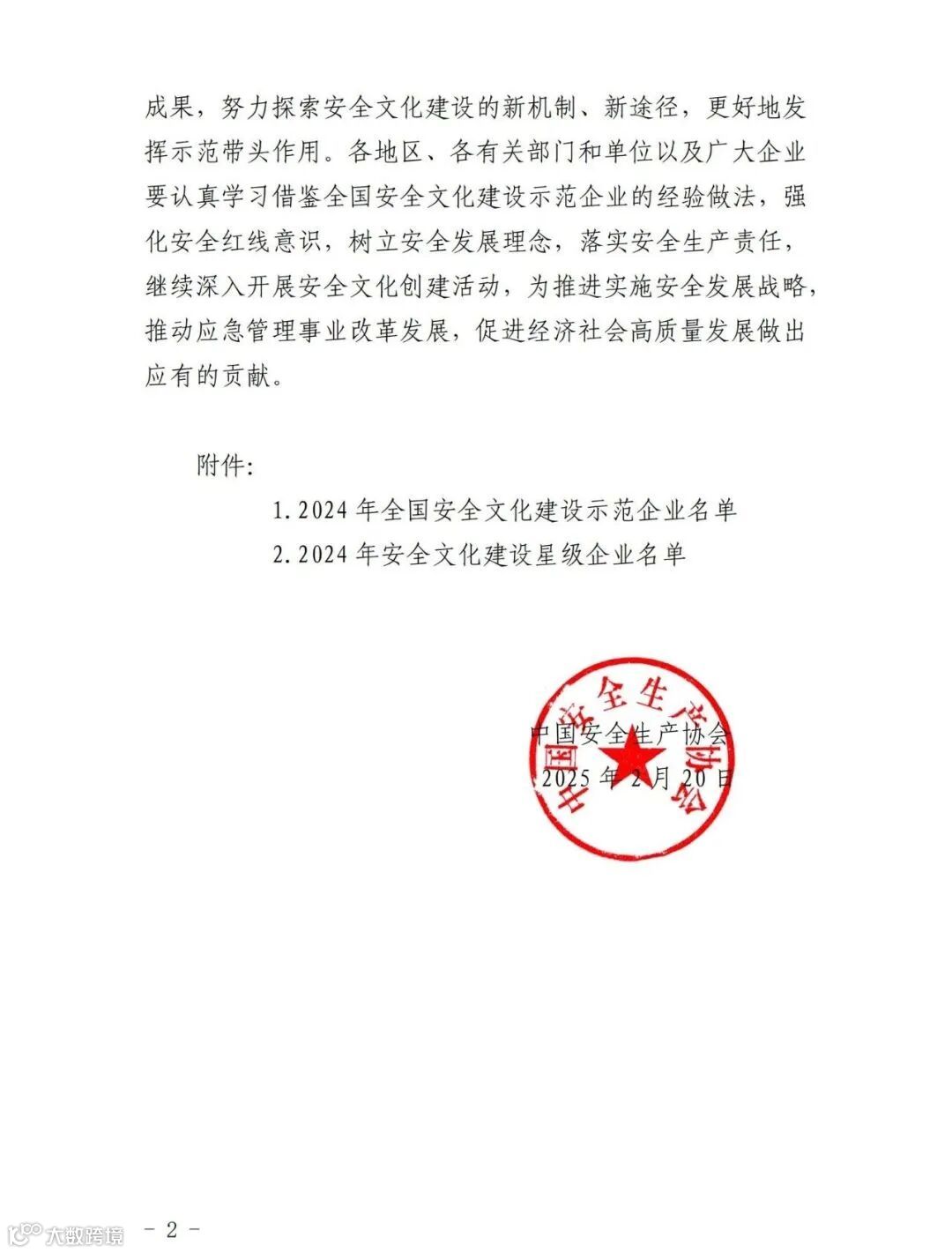 近日,中国安全生产协会发布《关于命名2024年全国安全文化建设示范企业的通知》,共147家单位被命名为2024年全国安全文化建设示范企业,其中上海有7家。上海环境集团下属上海天马再生能源有限公司作为7家单位之一光荣上榜。