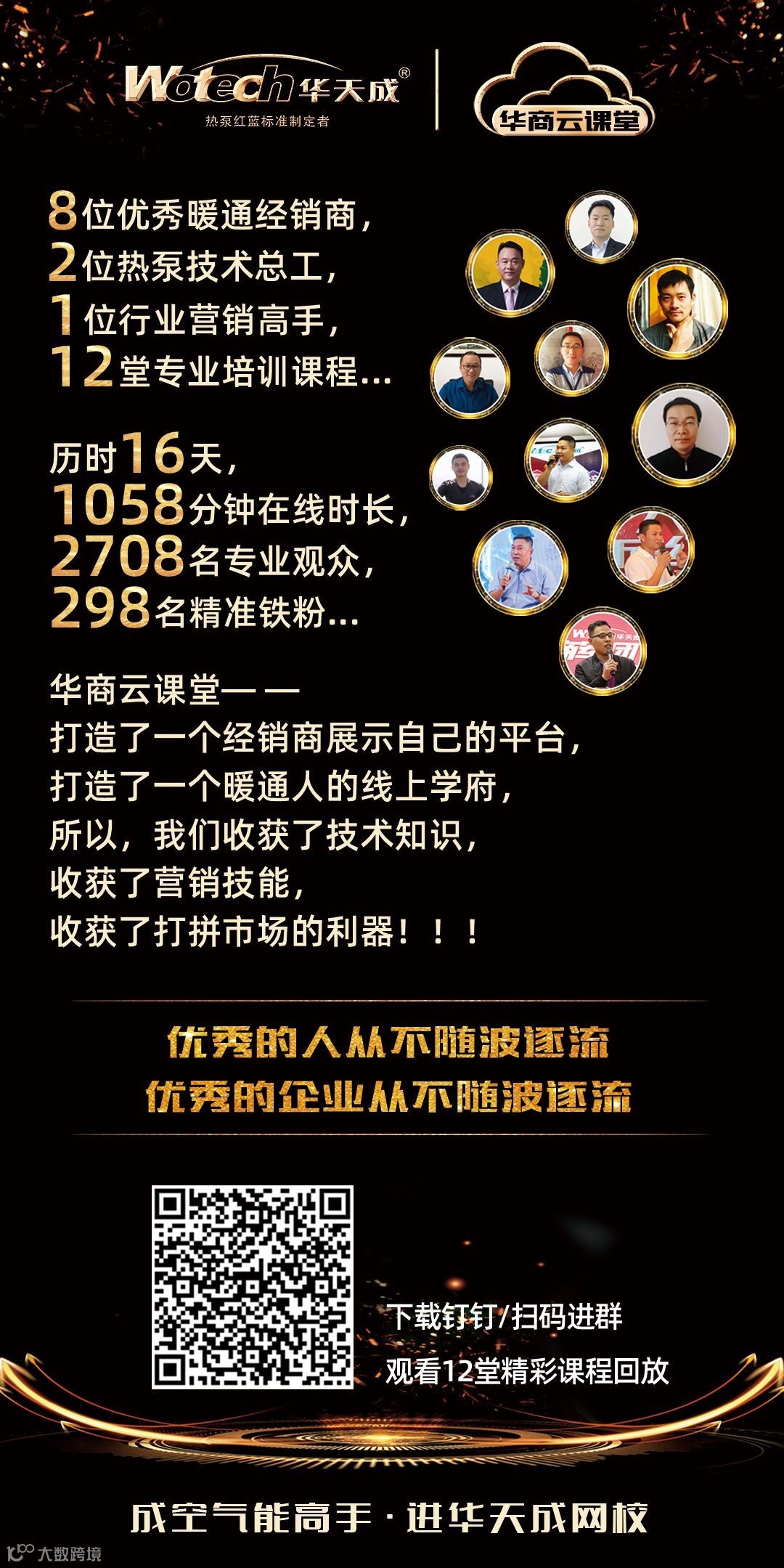 从直播课反馈来看,华天成12节专业空气能知识课得到了经销商的广泛赞誉,这也激励着华天成未来以更加专业的技术分享和经验共享服务广大经销商,为大家提供更加专业的热泵知识学习平台。