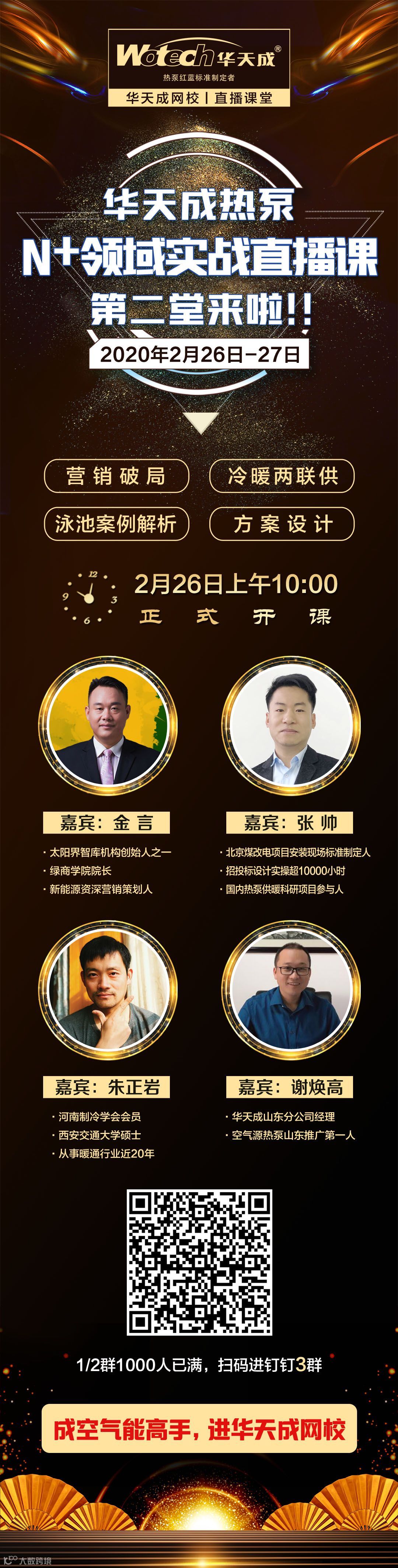 泳池恒温是高级酒店、桑拿、水疗会所等必备的一个项目,近年来,空气源热泵由于其诸多优势成为泳池领域的座上宾,也有越来越多经销商想涉足这一领域。2月27日下午,谢焕高将做客华天成网校直播间,为大家讲述空气源热泵在泳池领域的案例应用。