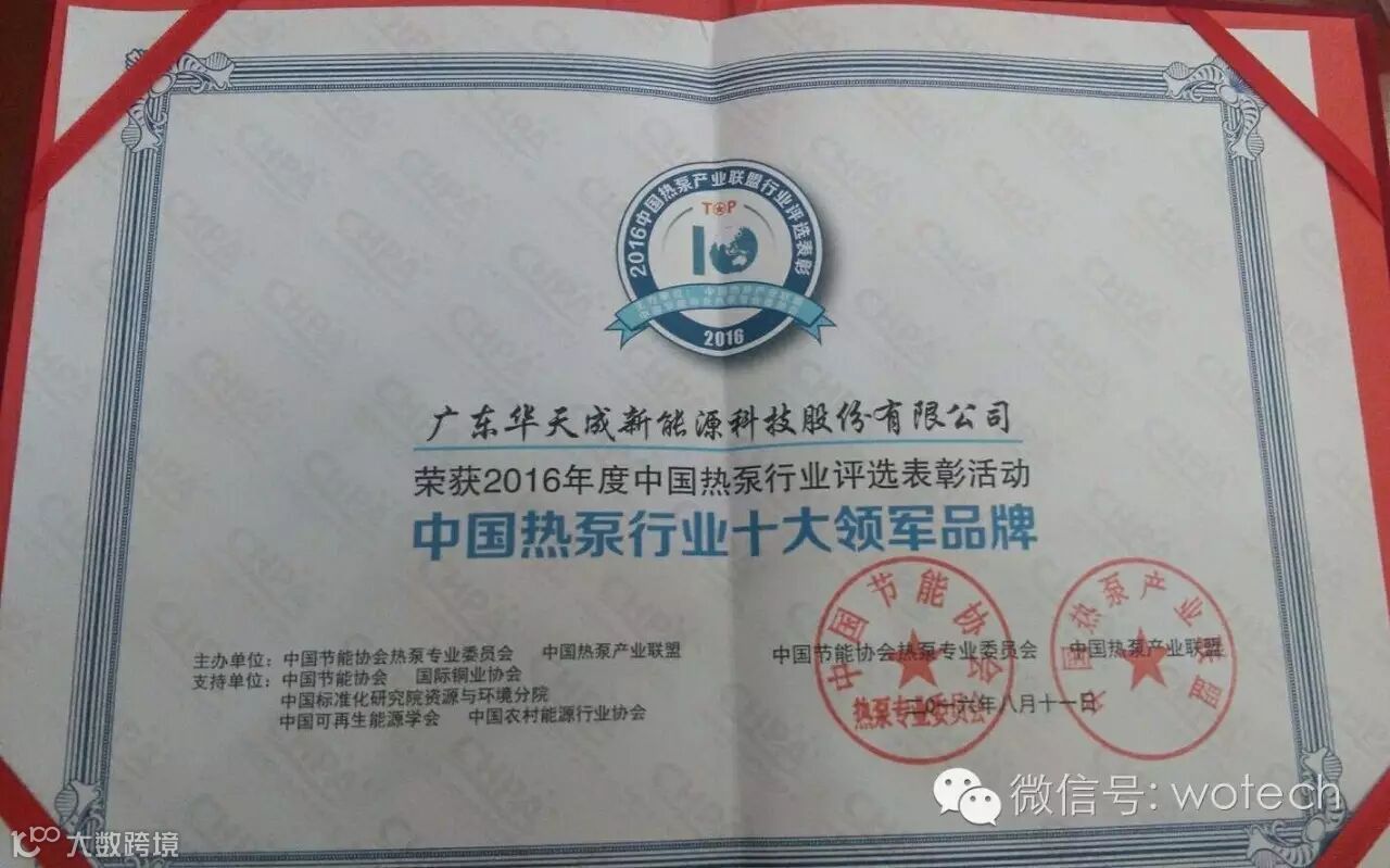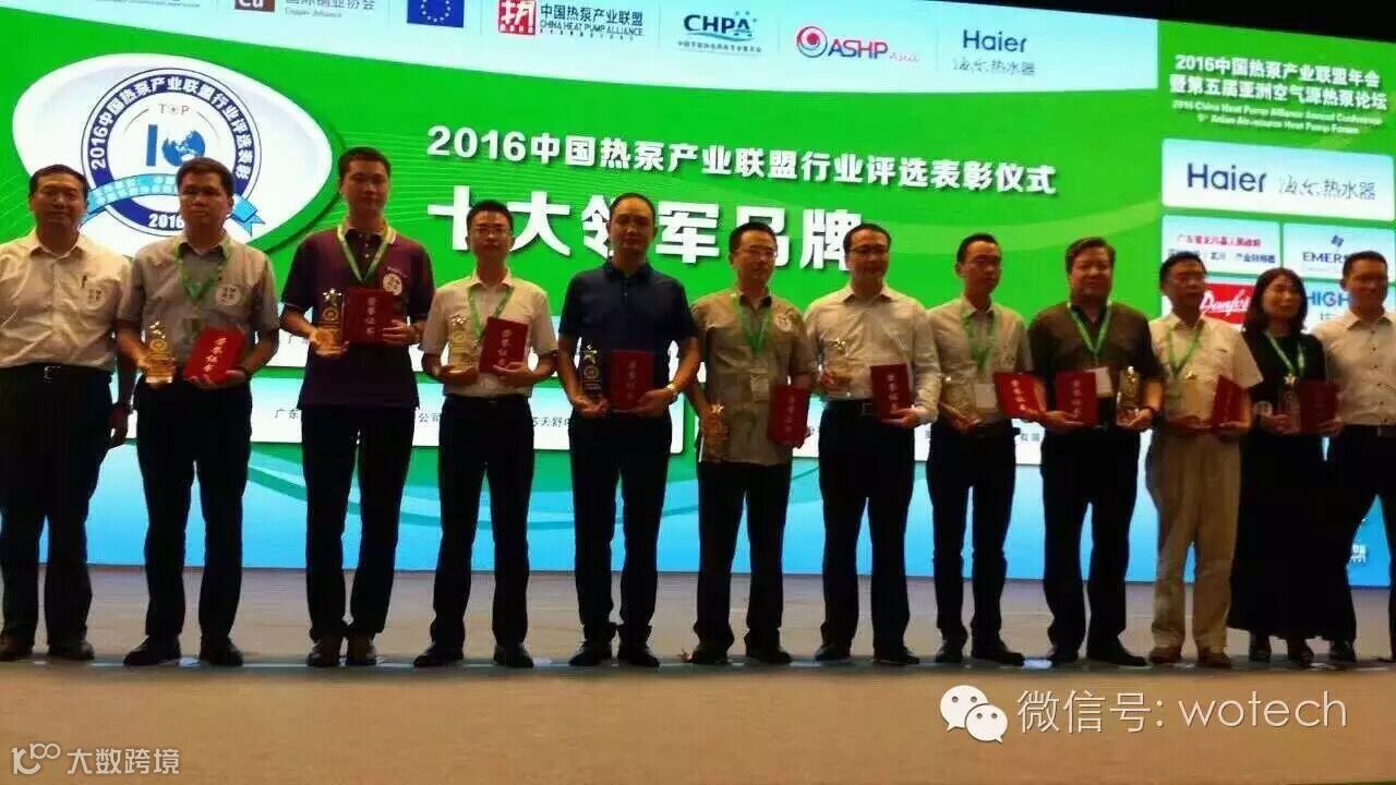 8月11日,2016中国热泵产业联盟年会在北京远望楼宾馆隆重召开,同期举办的2016中国空气源热泵行业评选仪式,将会议气氛推向高潮。今年年初成功登陆新三板的广东华天成新能源科技股份有限公司荣膺“十大领军品牌”大奖,成为行业焦点。这是华天成继荣获2015年度“十大领军品牌”大奖后再获殊荣,进一步证明了华天成在国内空气源热泵行业举足轻重的地位、强大的实力。