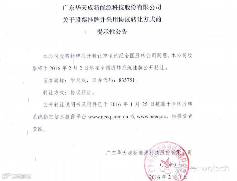 2016年2月2日,广东华天成新能源科技股份有限公司正式发布在全国股转系统公开转让公告,证券简称:华天成,证券代码:835751,这标志着华天成空气能成功跨进了资本市场。也因此成为空气源热泵行业首家成功在新三板上市的专业热泵品牌。广东华天成新能源科技股份有限公司前身为佛山市顺德区华天成电器有限公司,成立于2005年9月份,11年专注空气源热泵领域。