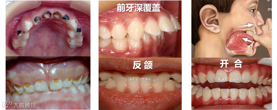 不良口腔习惯:吸吮手指;吐舌头;咬唇;开口呼吸。