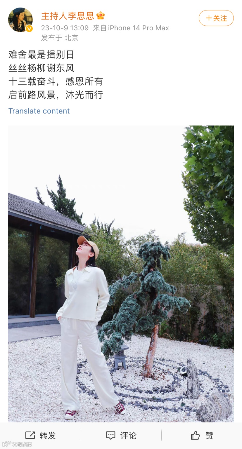 近日,央视主持人李思思在社交平台发文:“难舍最是揖别日;丝丝杨柳谢东风;十三载奋斗,感恩所有;启前路风景,沐光而行。”