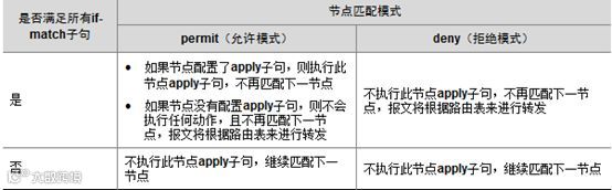 每个节点的具体内容由if-match子句和apply子句来指定。if-match子句定义该节点的匹配规则,apply子句定义该节点的动作。