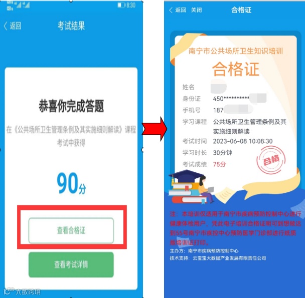 2.现场打印培训合格证明时,需向工作人员同时提供卫生知识培训电子合格证(截图或打印版均可)及在南宁市疾病预防控制中心办理的健康证明,两证齐全方能进行培训合格证的发放。