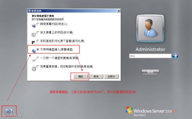 上一步修改完后重启服务器,从硬盘启动,在登录界面点击左下角的“轻松访问”,勾选屏幕键盘(其实已经将程序改成了cmd)