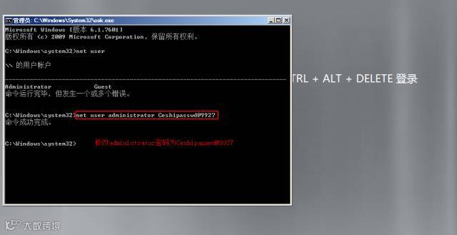 D:\>rename d:\windows\system32\cmd.exe osk.exe (将system32下的cmd.exe重命名为osk.exe,为下一步调用屏幕键盘时候能够调用命令提示符做准备)
