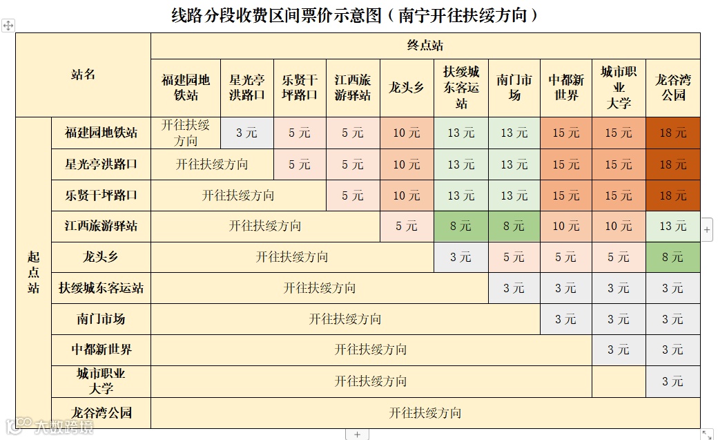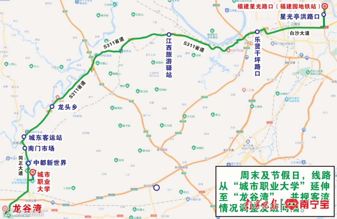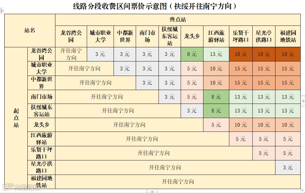 该线路采取定时发班+灵活调度模式,营运时间7:00-17:00(30分钟/班,在此基础上可视客流变化灵活增减调整班次),线路收费模式采取分段式收费,最低收费3元/人次,最高收费18元/人次。根据旅游性客流出行特点,线路采取在周末及节假日期间运行南宁福建园地铁站至扶绥龙谷湾公园全段,其他时段仅运行南宁福建园地铁站至城市职业大学区段(视客流实际也可随时调整为全段行驶)。