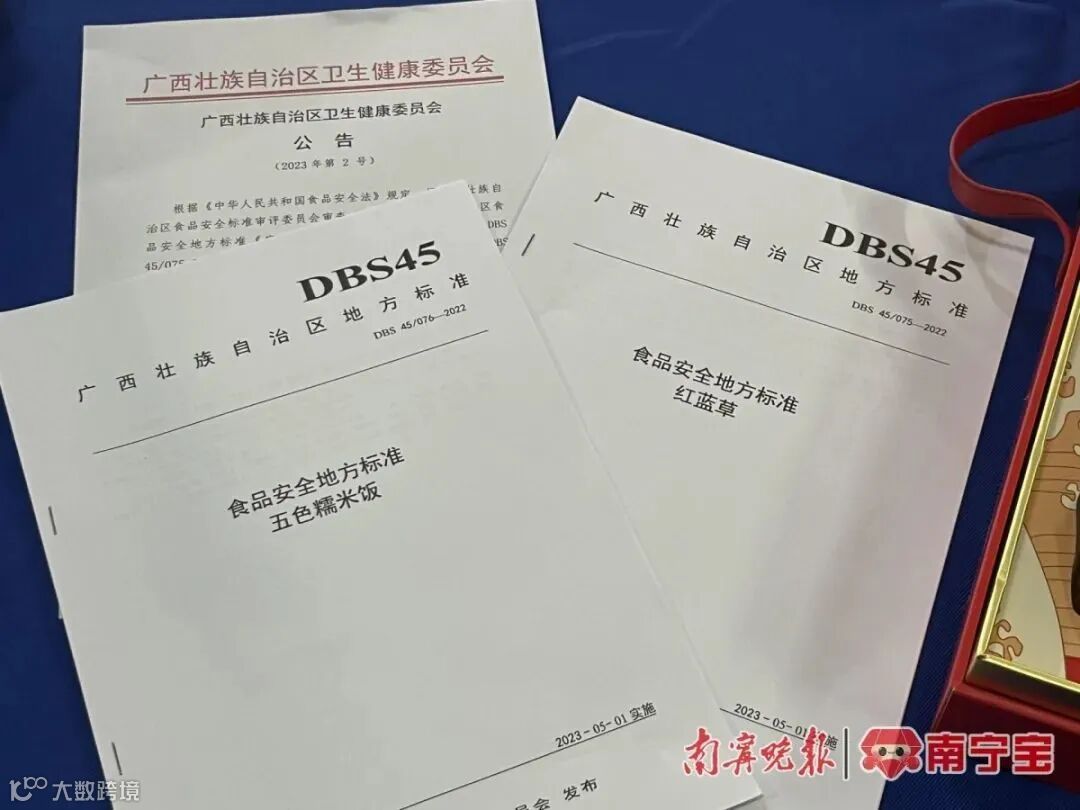 今年2月,在多方积极推动下,自治区卫生健康委正式发布《五色糯米饭》和《红蓝草》两项广西食品安全地方标准,并将于5月1日起实施。其中,红蓝草为五色糯米饭中的红色染色剂。不仅如此,壮族五色糯米饭预制菜团体标准也有望于今年4月颁布。