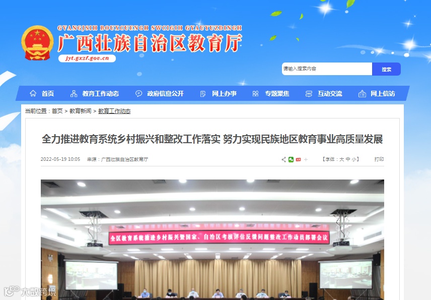 2022年5月,自治区党委教育工委开展动员部署会议,会议提到:全力推进教育系统乡村振兴和整改工作落实,努力实现民族地区教育事业高质量发展。不断扩大惠普性教育资源,扎实做好粤桂教育协作工作,下大力抓好教育人才“组团式”帮扶工作。