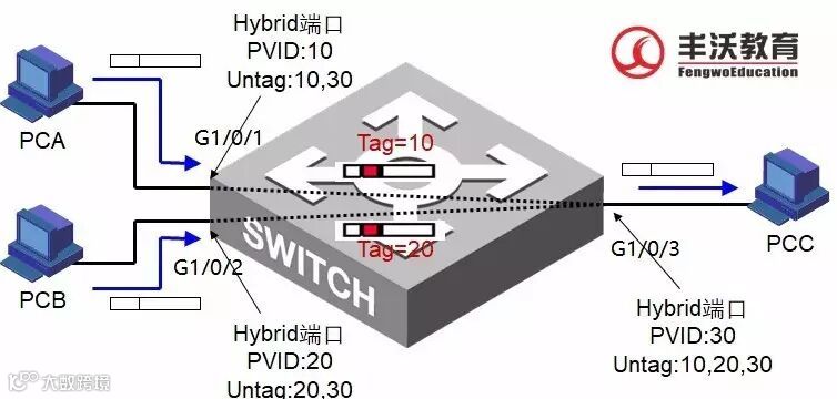 PCA访问PCC,数据发到交换机G1/0/1端口,交换机发现数据没有tag会加上PVID也就是vlan 10的tag,然后转发到G1/0/3,发现untag表里面有10和数据带的tag=10一样,就会把tag去掉后发送给PCC。