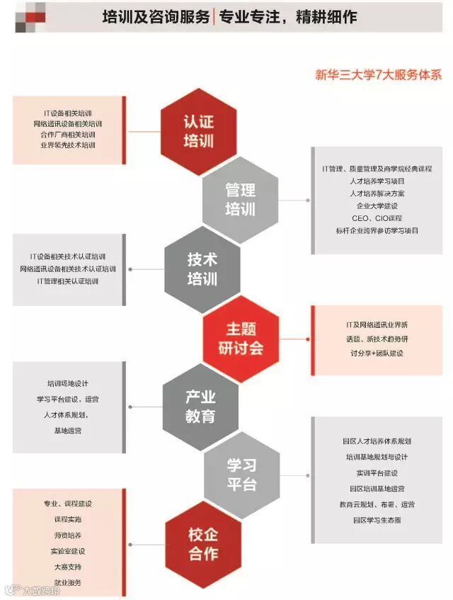 新华三大学在整合新华三集团教育培训资源后全新起航,融合中国惠普大学和华三培训认证中心的双重实力,重磅推出以产业教育、管理培训、技术培训、认证培训、学习平台、主题研讨会、校企合作为核心的七大服务体系。七大服务体系涵盖了从专业到通用,从普及到认证,从校园到企业,从园区到产业的全方位领域,并向客户提供横向和纵深的专业学习培训咨询方案。作为学习咨询解决方案的领导者,新华三大学将继续在新IT、新经济业态下与客户和合作伙伴一起点亮中国培训生态圈。