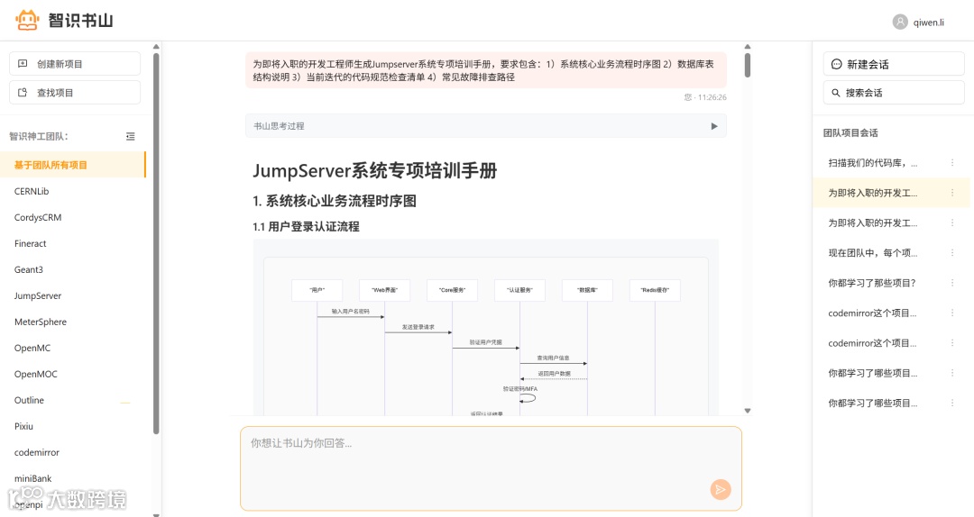 问书山:"为即将入职的开发工程师生成XX项目专项培训手册,要求包含:1)系统核心业务流程时序图 2)数据库表结构说明 3)当前迭代的代码规范检查清单 4)常见故障排查路径,"