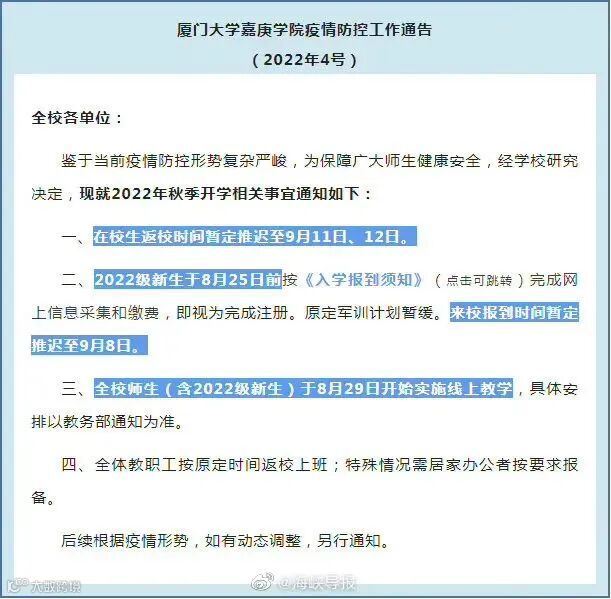 近日,受疫情等因素影响,多所陕西、海南、福建、辽宁、广东、吉林高校发布通知,推迟2022级新生入学报到时间。