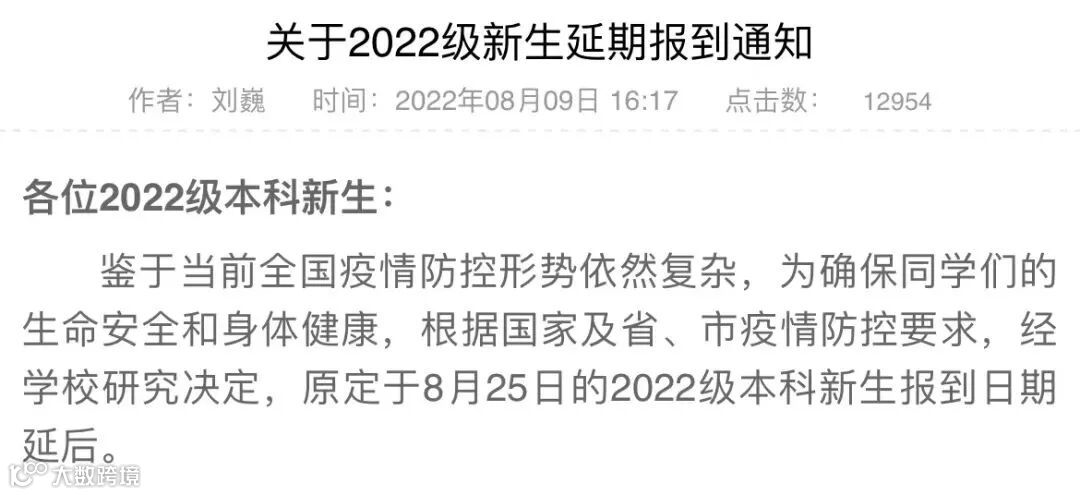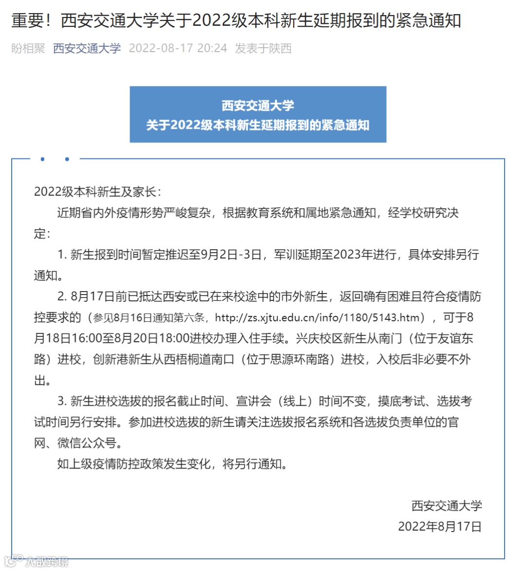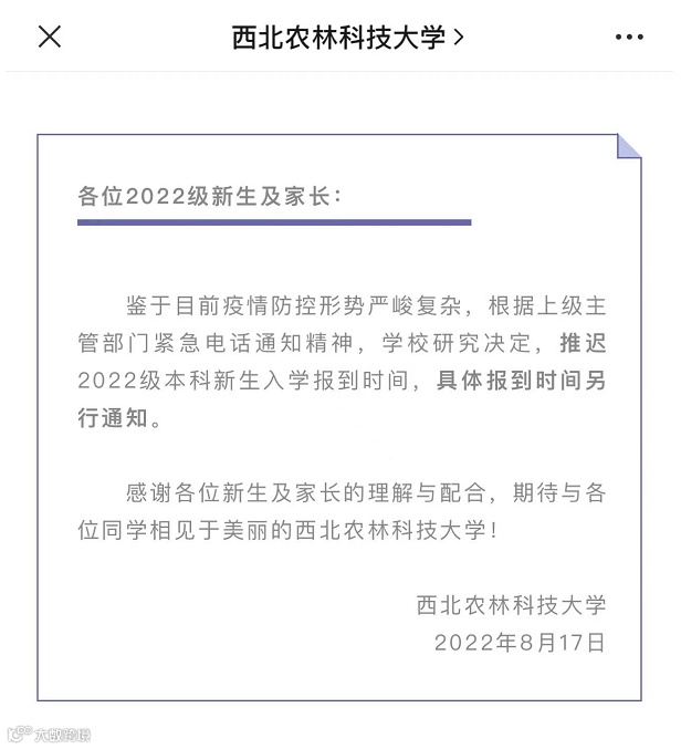8月17日,西北农林科技大学发布通知:鉴于目前疫情防控形势严峻复杂,根据上级主管部门紧急电话通知精神,学校研究决定,推迟2022级本科新生入学报到时间,具体报到时间另行通知。