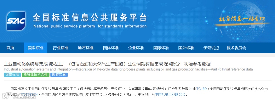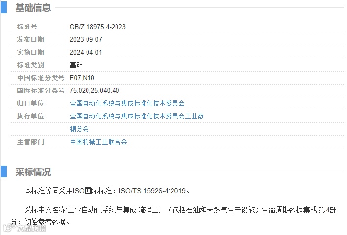 此标准由TC159(全国自动化系统与集成标准化技术委员会)归口,TC159SC4(全国自动化系统与集成标准化技术委员会工业数据分会)执行 ,主管部门为中国机械工业联合会。此标准将于2024-04-01实施。