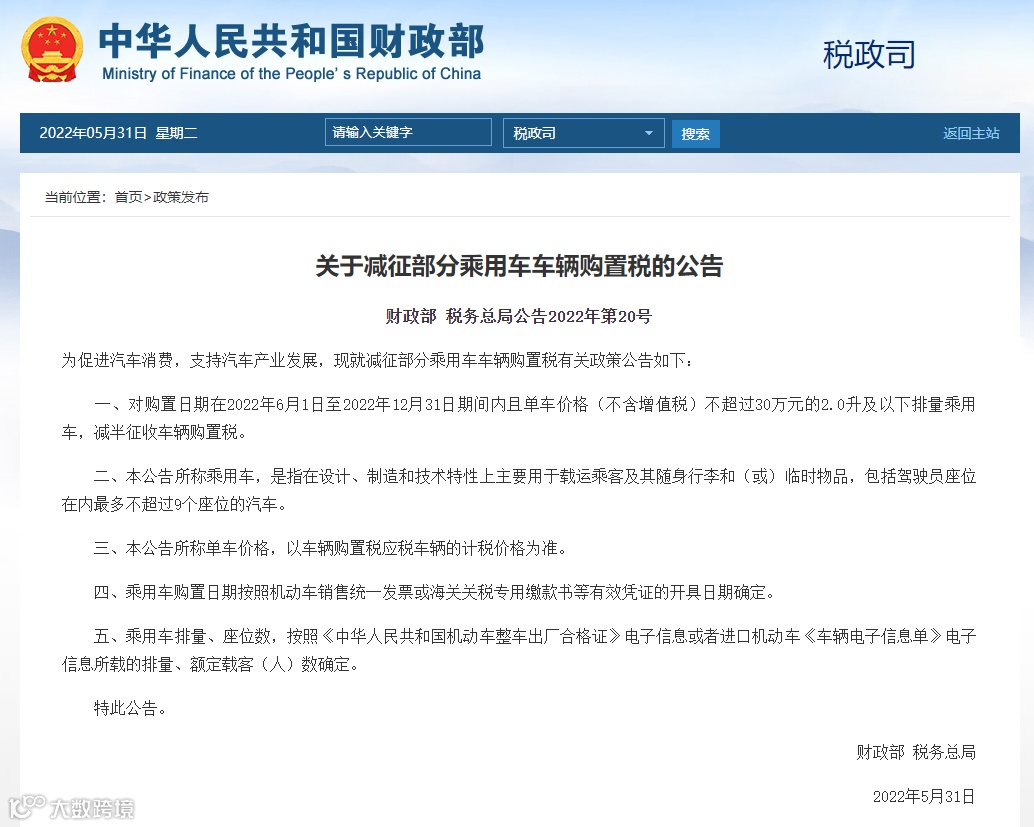 据财政部网站消息,财政部、税务总局31日发布公告,对购置日期在2022年6月1日至2022年12月31日期间内且单车价格(不含增值税)不超过30万元的2.0升及以下排量乘用车,减半征收车辆购置税。