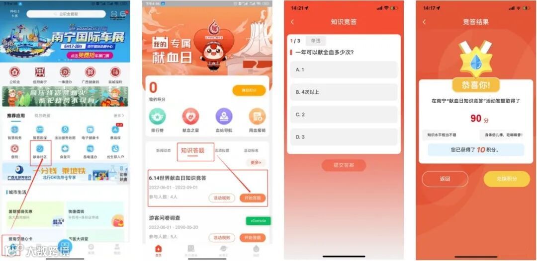 打开“爱南宁”APP——在“爱南宁”APP的“首页”点击“献血社区”应用——点击“知识答题”——找到“6.14世界献血者日知识竞答”并点击“开始答题”进入答题。