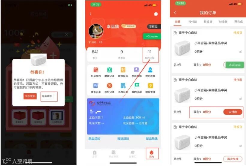 (二)用户可前往积分商城每消耗10积分参与一次抽奖。若用户抽中积分、优惠券,直接发放至“爱南宁”APP献血社区账户内;若用户抽中礼品,则以一件代发的形式将实物邮寄到用户手中(奖品将于本月发出)。本次活动奖品丰厚,小伙伴们赶紧奔走相告吧!
