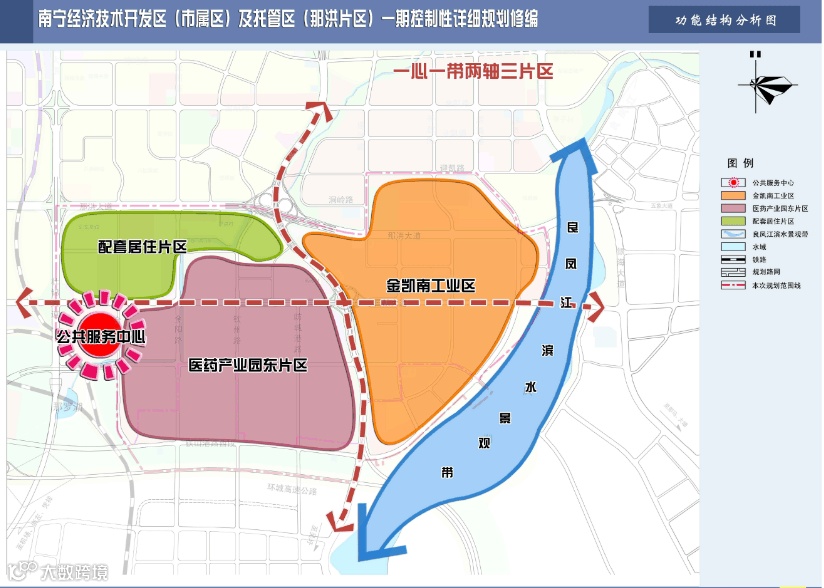 根据功能结构分析图显示,该片区为“一心一带两轴三片区”,东部为良凤江滨水景观带,包括金凯南工业区、医药产业园东片区、配套居住片区、公共服务中心。