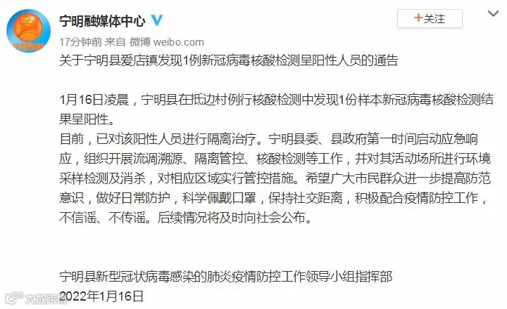 1月16日凌晨,宁明县在抵边村例行核酸检测中发现1份样本新冠病毒核酸检测结果呈阳性。