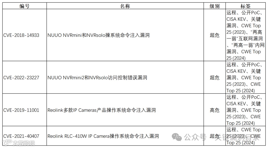 2024年12月19日摄星科技“关键漏洞目录”新增4个漏洞,包括NUUO NVRmini和NVRsolo操系统命令注入漏洞和NUUO NVRmini2和NVRsolo访问控制错误漏洞。关键漏洞目录漏洞总数增加到1242个。
