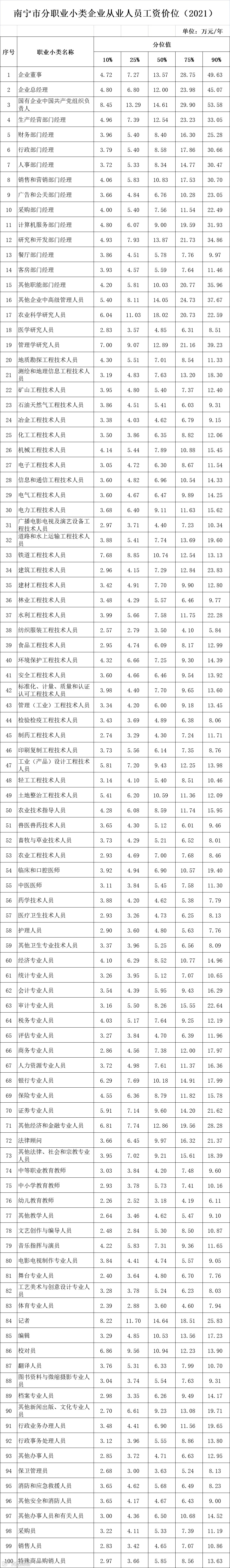 ▲滑动查看:南宁市分职业小类企业从业人员工资价位(2021)。