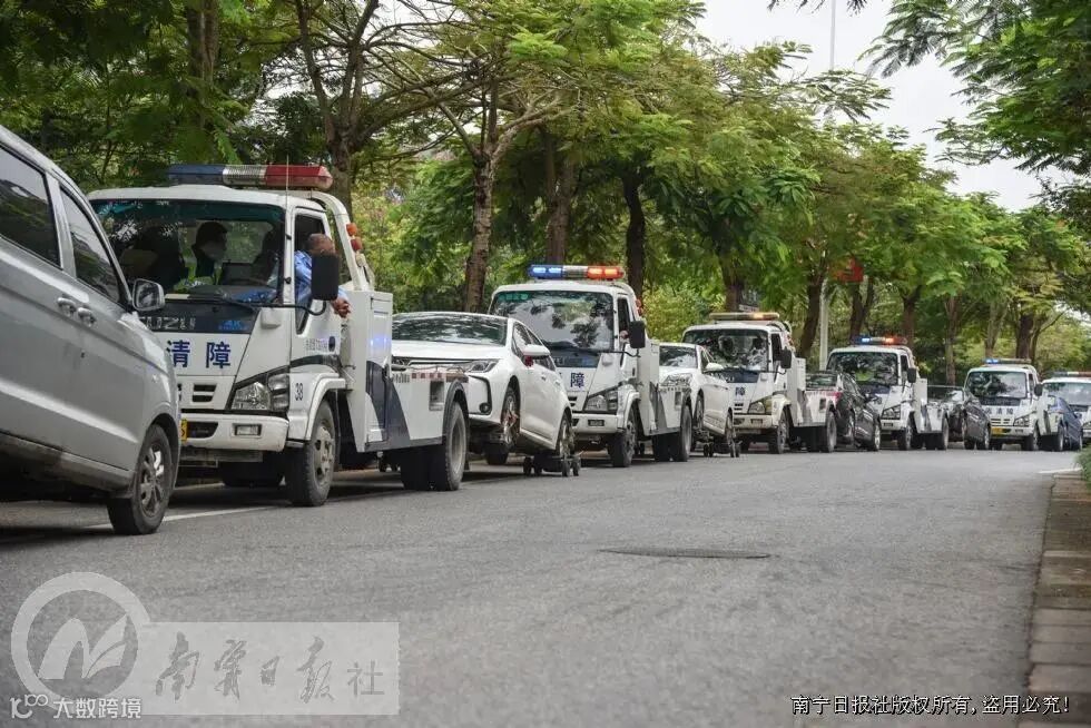 近段时间以来,南宁交警多次接到群众举报,称坛洋路上车辆违法停放现象较为突出。为此,交警六大队多次组织警力开展整治,但效果不甚理想,仍有车主带着侥幸心理违法停车,严重正常交通秩序,与城市文明十分不和谐。为给市民营造安全、畅通、有序的道路交通环境,根治这一违法现象,当天上午8时许,南宁交警出动拖车开展整治行动。截至当日上午10时许,共拖移违停车辆40余辆。