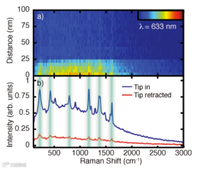 图2:(a) 不同探针-样品间距的光谱随着激发光与沉积在金(Au)基底上的孔雀石绿单层产生共振激发。由于在探针尖端增强光场的高空间限制,信号仅在探针-样品间距小于25纳米时增加。从(a)中的接近曲线和(b)中通过剪力反馈获取的光谱中,可以观察到孔雀石绿的特征峰。当与探针收回时观察到的远场背景信号相比,(b)中的近场贡献变得明显。
