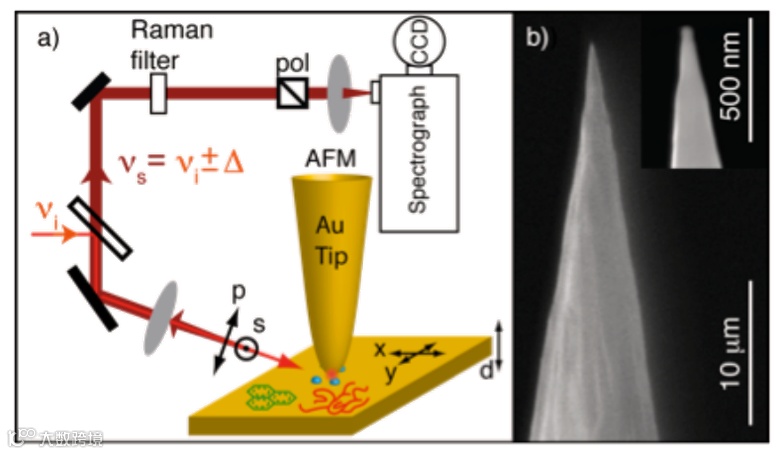 图1:(a)TERS实验示意图。入射光通过长工作距离显微镜物镜聚焦到尖端样品间隙上。尖端样品距离是通过AFM或STM反馈实现的。通过相同的物镜收集后向散射光,进行光谱滤波,并使用带有N2(l)冷却CCD阵列的光谱仪进行检测。((b) 电化学蚀刻Au尖端的SEM图像和半径约为20 nm的尖端尖端的高分辨率图像如插图所示。