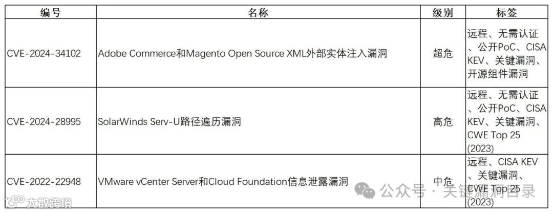 2024年7月17日摄星科技“关键漏洞目录”新增3个漏洞,包括Adobe Commerce和Magento Open Source XML外部实体注入漏洞。关键漏洞目录漏洞总数增加到1132个。