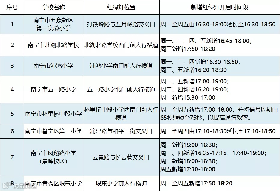 例如良庆区打铁岭路与五月岭路交叉口,南宁市五象新区第一实验小学放学时间调整后,红绿灯开启时间由16:30-18:00,变成了16:30-18:50。