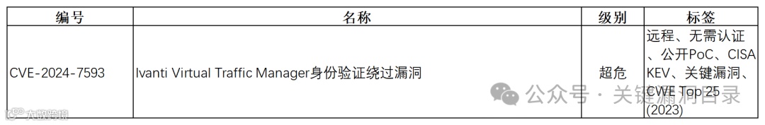 2024年9月24日摄星科技“关键漏洞目录”新增Ivanti Virtual Traffic Manager身份验证绕过漏洞。