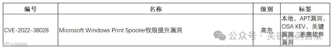 2024年4月23日摄星科技“关键漏洞目录”新增Microsoft Windows Print Spooler权限提升漏洞(CVE-2022-38028)。