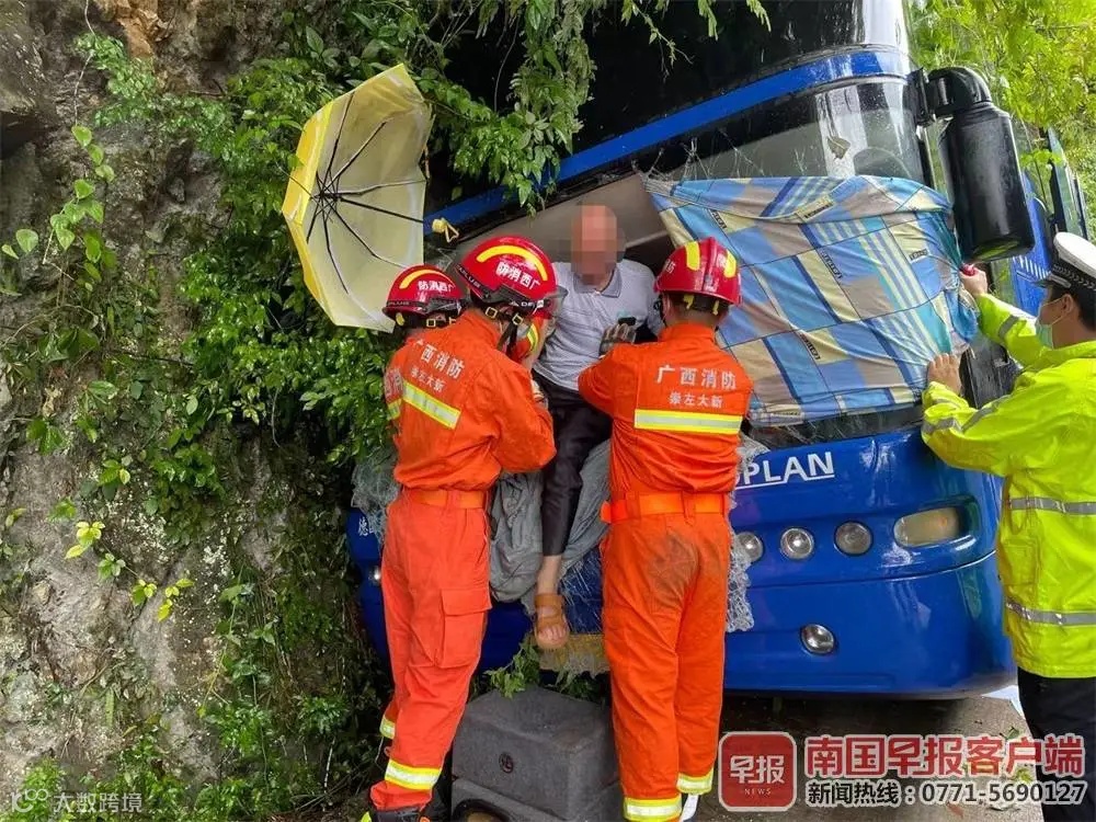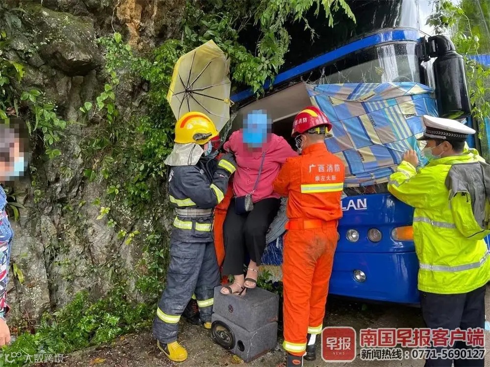崇左市消防救援支队接到报警后,立即调派救援人员赶赴现场。消防员在现场看到,一辆旅游大巴车撞到路旁的山体,车门一侧与山体紧紧相贴,无法打开。经了解,事故发生后,车上有多人不同程度擦伤,但由于车门被卡,无法逃出。