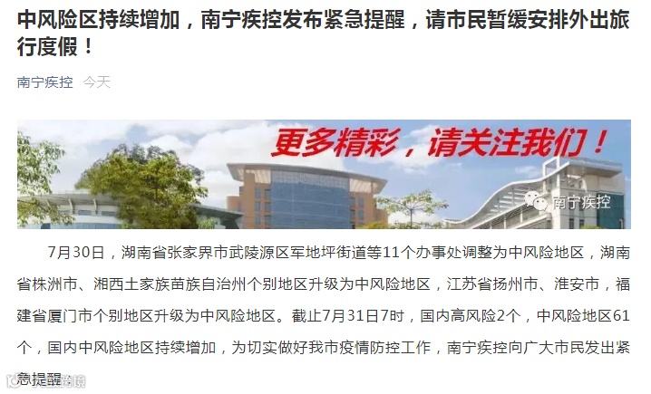 7月30日,湖南省张家界市武陵源区军地坪街道等11个办事处调整为中风险地区,湖南省株洲市、湘西土家族苗族自治州个别地区升级为中风险地区,江苏省扬州市、淮安市,福建省厦门市个别地区升级为中风险地区。截止7月31日7时,国内高风险2个,中风险地区61个,国内中风险地区持续增加,为切实做好我市疫情防控工作,南宁疾控向广大市民发出紧急提醒: