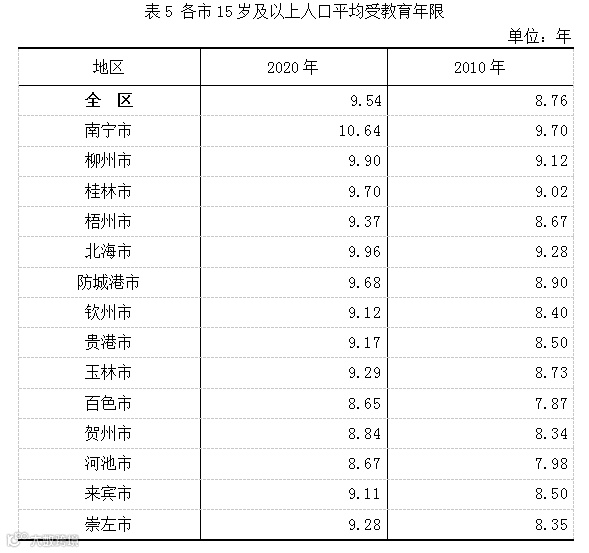 与2010年第六次全国人口普查相比,全自治区常住人口中,15岁及以上人口的平均受教育年限由8.76年提高至9.54年。