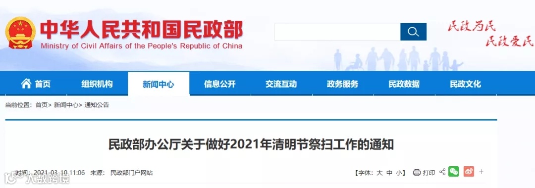 3月10日,民政部办公厅发布《关于做好2021年清明节祭扫工作的通知》。