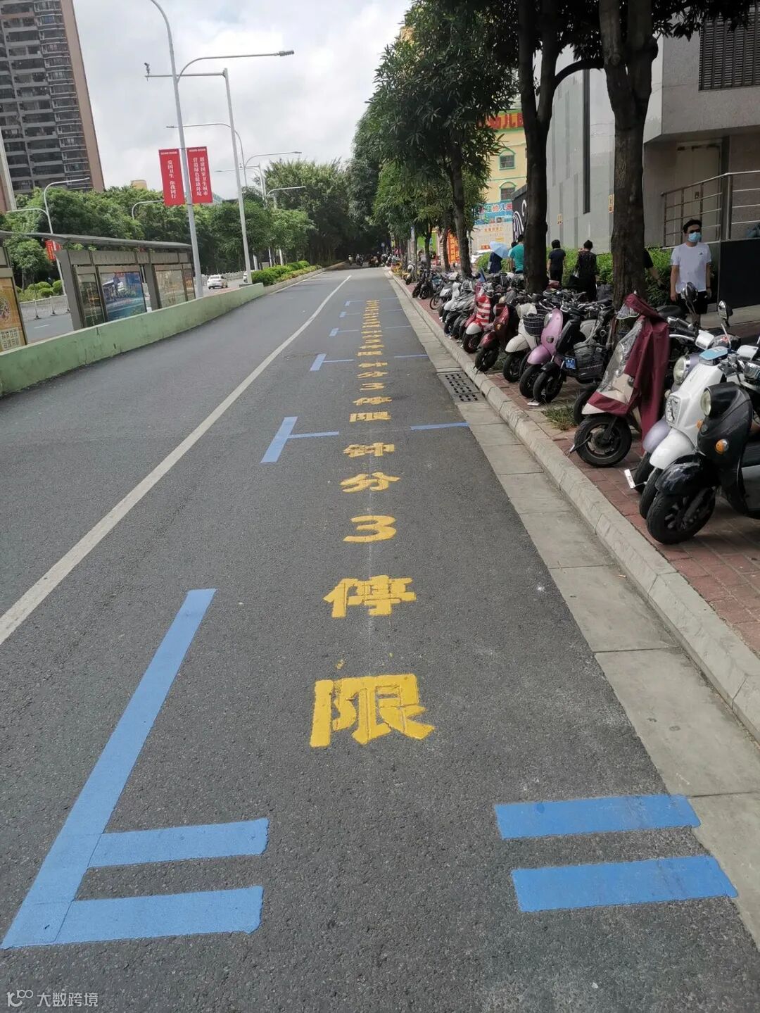 短时停车位采用蓝色限时停车位标线,泊位内使用黄色标线设置“限停3分钟”字样,并配合设置“限停3分钟”停车标志牌,以及辅助说明“违停监控区域”标志牌。其他停车位无此样式的标志标线。请广大驾驶人注意辨识,避免与其他停车位混淆。