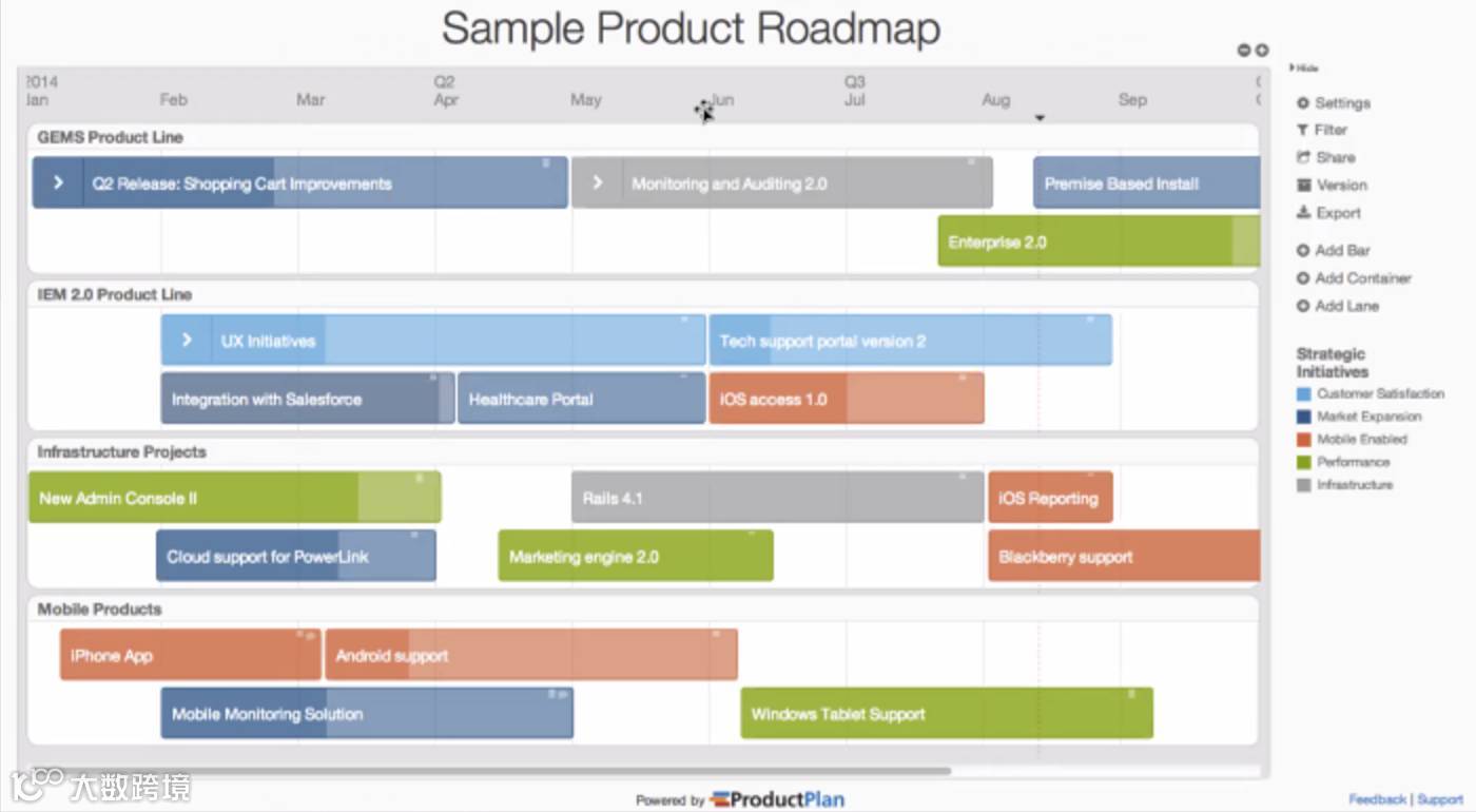 例:某公司的产品路线图,有清晰的时间段、产品线和计划(initiative)