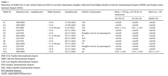 2021年11月29日,澳大利亚报告了第一例Omicron病例,该病例乘坐航班回到澳大利亚。根据前期的监测经验,澳大利亚卫生部门推测在飞机的废水样本中可能存在Omicron变体。